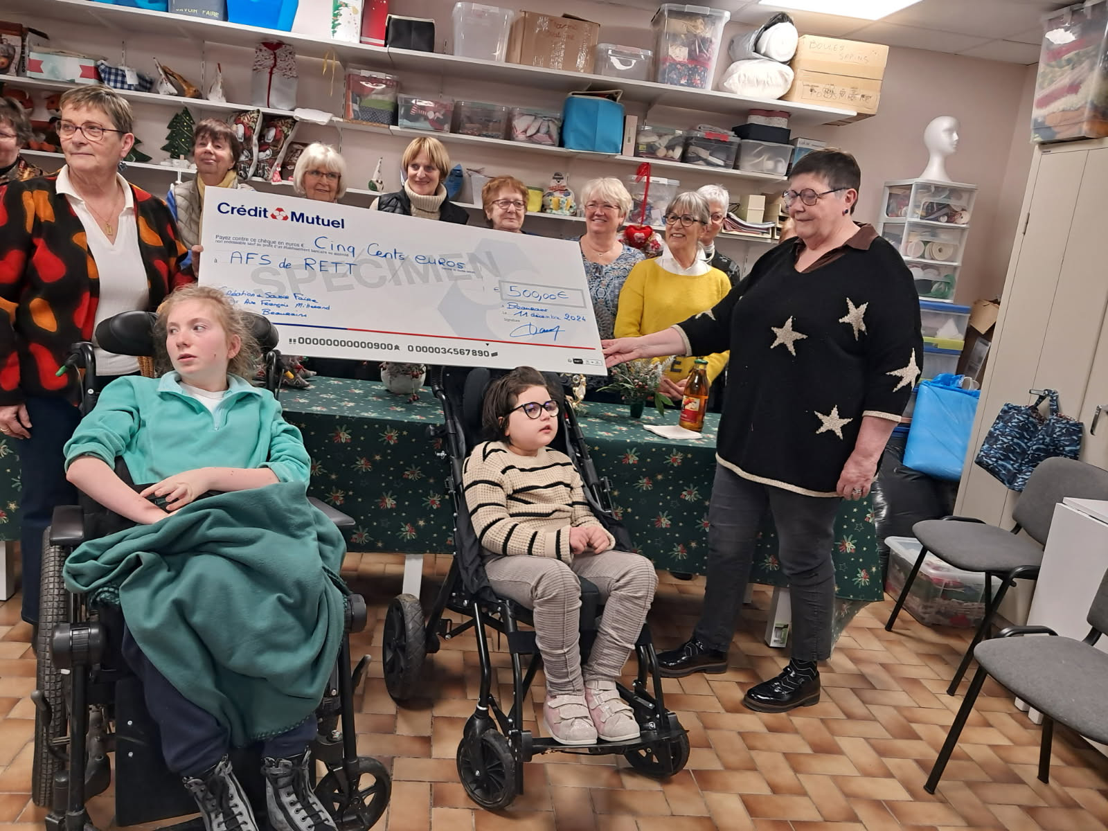 Ces drôles de dames décident de récolter des dons durant leur salon création du mois de novembre au profit de... Je vous laisse deviner. Un joli événement où nous les rencontrons avec d’autres familles du Nord touchées par le syndrome de Rett et venues représenter l'association. Bien sûr, personne ne résiste au sourire de nos filles. Nos bénévoles au grand cœur les adoptent tout de suite... Ventes de cases, tombola, on parle, on explique , on partage. Et voilà une remise de chèque plutôt généreuse qui s’organise quelques semaine plus tard. Nous voilà de nouveau réunis autour d’un café et de quelques gâteaux. Mais déjà nos couturières ont déjà un autre projet en tête. Elles repèrent la cape-manteau de maelle. Un défi est lancée entre elles : confectionner des capes bien chaudes.