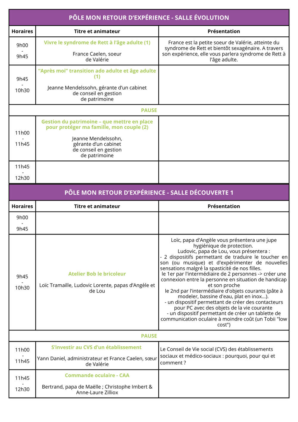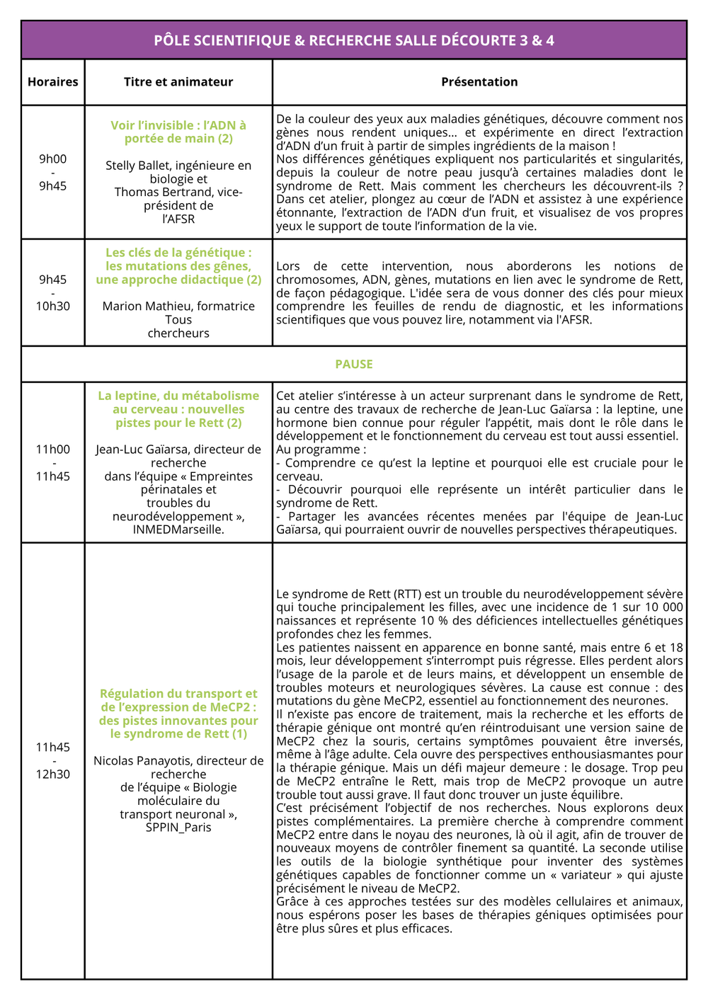 Dans une ambiance résolument festive et chaleureuse, nous aborderons sans détour les réalités complexes du syndrome de Rett, avec des temps d’échange, d’information et de réflexion à la hauteur des enjeux.
